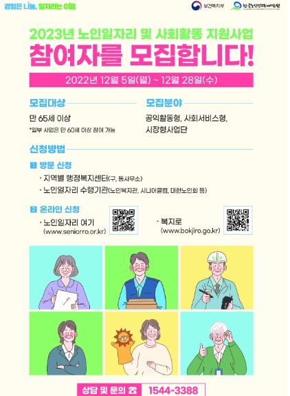 보건복지부는 12월 5일부터 12월 28일까지 2023년 노인일자리 및 사회활동 지원사업(공익활동, 사회서비스형, 시장형 사업단)의 참여자 모집을 시작한다고 밝혔다.