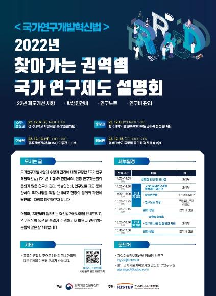 과학기술정보통신부가 12월 1~2주동안 전국 4대 권역에서(수도?강원, 충청, 호남, 영남) ?2022년 찾아가는 권역별 국가연구제도 설명회?(이하 권역별 설명회)를 개최한다고 밝혔다.