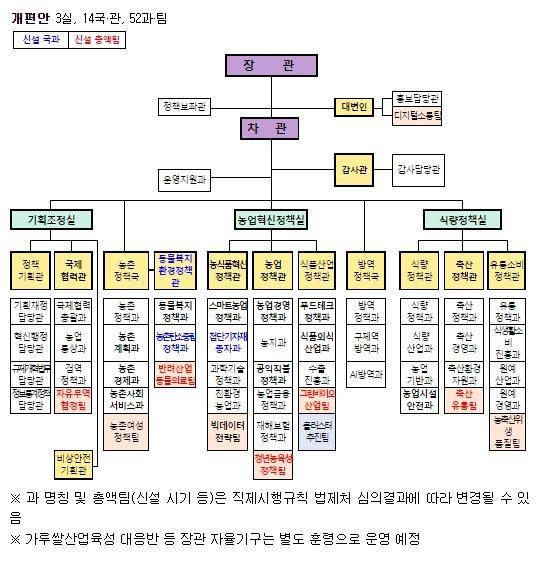 - 농업생명정책관을 농식품혁신정책관으로 개편하여 스마트농업 등 미래농업 관련 법률·제도 정비, 정보통신기술(ICT) 기기 표준화, 빅데이터 활용, 첨단농기자재 육성 및 연구개발(R&D) 등 일련의 과정을 전담토록 함