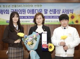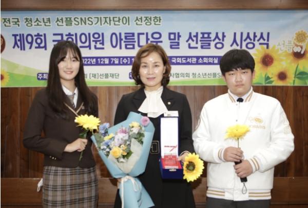 ‘국회의원 아름다운 말 선플상’은 전국 고등학생과 대학생 300명이 직접 국회 상임위 등 회의록을 분석해 선한 언어 사용으로 타에 모범을 보여준 국회의원에게 수여하는 상이다.