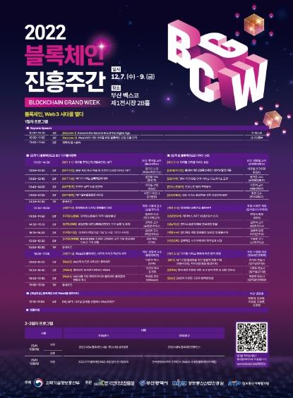 과학기술정보통신부는 국민께 디지털 시대의 신뢰를 담보하는 기술인 블록체인의 가치를 알리고 정부의 다양한 사업 성과와 향후 정책 방향을 공유하기 위한 ‘2022 블록체인 진흥주간’을 오는 12월 7일부터 9일까지 부산 벡스코에서 개최하며, 아울러 7일 오후 부산 국제금융센터에서는 지역 블록체인 관련 기업의 성장을 체계적으로 지원하고 융합산업을 발굴할 ‘블록체인 기술혁신센터’를 개소한다고 밝혔다.
