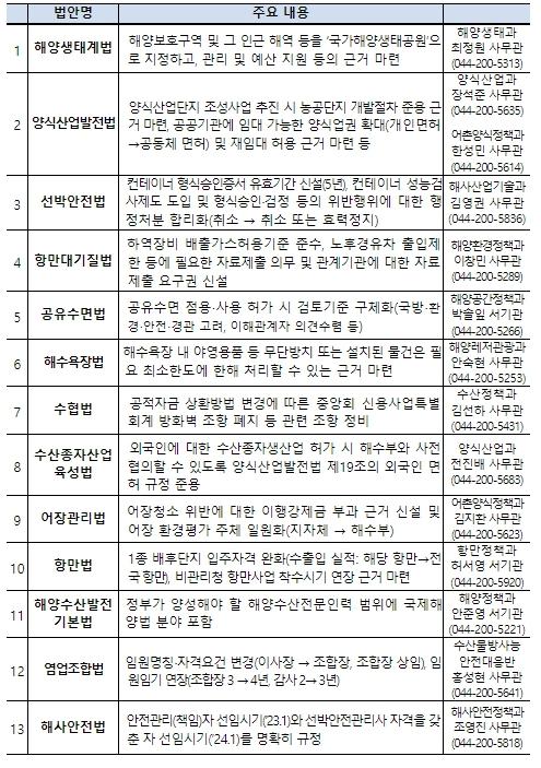 해양수산부는 ?해양생태계의 보전 및 관리에 관한 법률 일부개정법률안?, ?양식산업발전법 일부개정법률안?, ?항만법 일부개정법률안? 등 해수부 소관 법률 개정안 13건이 12월 8일 국회 본회의를 통과했다고 밝혔다.