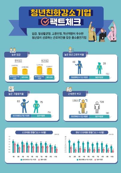 청년친화강소기업은 중소·중견기업에 대한 청년층 인식개선 및 조기 취업을 촉진하기 위해 2016년부터 매년 선정하고 있다. 2023년도 선정 절차는 통합선정지표를 기준으로 점수를 부여하고, 산재사망사고 발생, 신용평가등급 B-미만 등 결격요건에 해당하는 기업들을 제외했다.