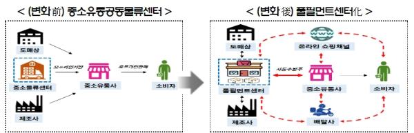 중소유통 풀필먼트 센터가 구축되면 동네슈퍼 등 중소유통은 상품 주문?판매?배송 등을 온라인 기반으로 수행할 수 있게 되며,소비자 입장에서는 온라인 플랫폼을 통해 동네점포(수퍼)의 상품을 실시간으로 확인하고, 주문?결제?배송 서비스를 받을 수 있다.