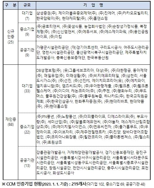 이번에 새로 소비자중심경영(CCM)을 도입한 기업은 25개사, 재인증을 받은 기업 68개사로, 소비자중심경영(CCM) 인증기업 수는 총 219개(2023. 1. 1. 기준)에 이르렀다.