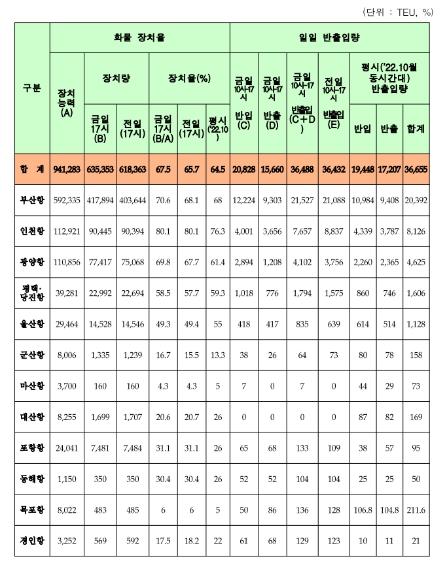 (항만) 일일 컨테이너 반출입량은 전국 12개 항만 평시대비 124%, 부산항 132%로 11.25일 이후 최고치 지속을 갱신했다.