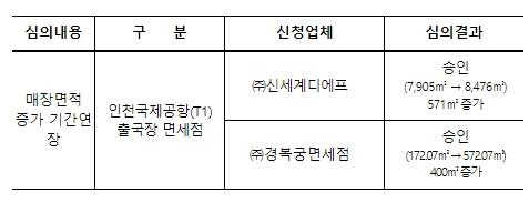 12.13일 제6회 보세판매장 특허심사위원회(위원장 호서대 양동우 교수)는 올 연말(12.31.)에 매장면적 증가(임시매장 운영) 기간이 만료되는 인천공항(T1) 출국장 면세점의 매장면적증가 기간 연장(~23.6.30.까지) 신청에 대하여 사업계획서 등을 평가한 결과 심의·의결했다.