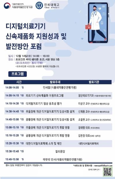 포럼의 주요 내용은 ▲디지털치료기기의 성능·안전성 평가 방법과 임상적 유효성 평가 방법 안내 ▲디지털치료기기 개발 현황 공유 ▲디지털치료기기 제품화 지원 사례와 성과 소개 ▲임상시험 지원 방안 논의 등이다.