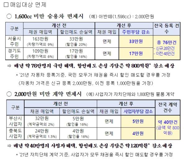 전국 시·도(창원시 포함)는 1,000~1,600cc 미만 소형 자동차 및 2천만 원 미만 소액 계약 등의 채권 매입을 면제하기 위해 오는 2023년 2월말까지 시·도별 조례를 개정하고 2023년 3월부터 전국적으로 시행할 예정이다.
