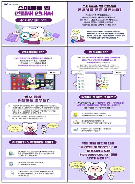 아울러 방통위는 스마트폰 메모리와 데이터·배터리 소진, 소비자의 앱 선택권 제한 등 스마트폰 앱 선탑재로 인한 이용자의 불편을 해소하기 위해 사업자가 준수해야 하는 ?스마트폰 앱 선탑재 관련 전기통신사업법 금지행위 안내서?(이하 ‘안내서‘)를 발간?배포한다.