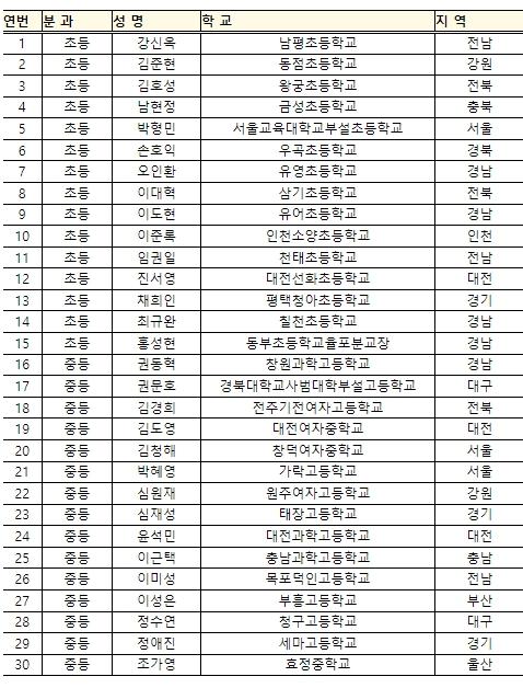 시상 분과는 초등과 중등 2개 분과로, 각 15명씩 총 30명의 교사가 과학 수업 개선, 과학교육 연구 및 전문가 활동, 과학 활동지도, 과학문화 확산 등에 기여한 공로가 인정됐다.