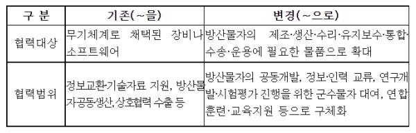 이번 MOU 개정은 1996년 MOU 제정 이후 26년 만에 개정을 추진한 것으로, 양국이 무기체계의 공동 연구개발부터 시험평가에 이르기까지 협력범위를 확장하고, 무기체계·군수물자·소프트웨어·인력 및 기술지원 등으로 협력대상을 확대했다.
