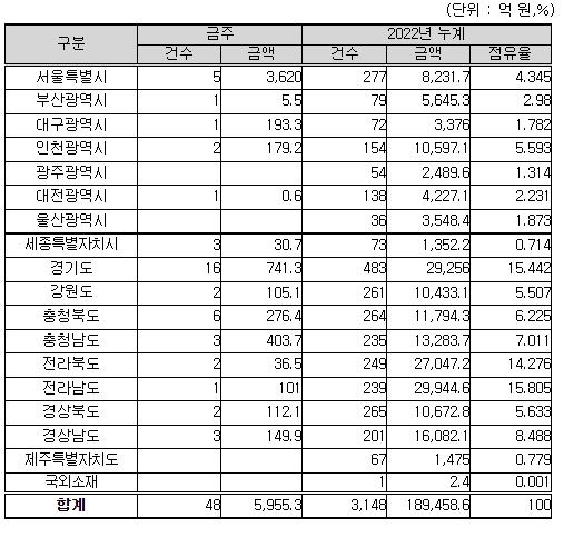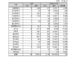지역별로는 서울특별시 3,620억 원, 경기도 741억 원, 충청남도 404억 원, 그 밖의 지역이 1,190억 원이다.