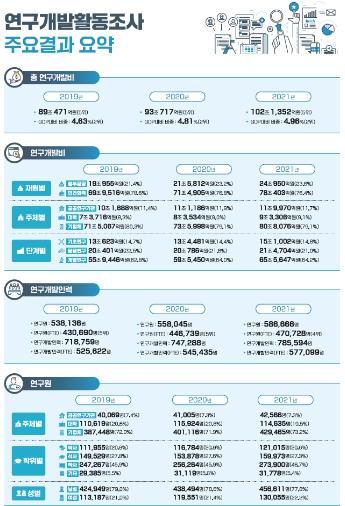 2021년 우리나라의 총 연구개발비는 102조 1,352억원으로 전년(93.1조원)대비 9조 636억원(9.7%)이 증가하여 처음으로 100조원 시대를 열게 됐고, 국내총생산(GDP) 대비 연구개발비 비중은 4.96%로 이스라엘에 이어 세계 2위권 수준을 유지했다.