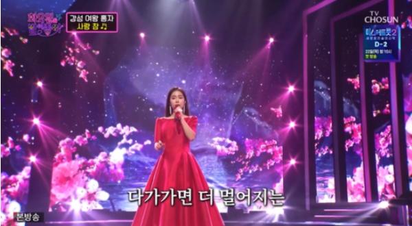 '미스트롯1' 대표 주자로 나선 홍자는 장윤정의 '사랑 참'을 열창, 폭발적인 고음과 애드리브로 곡의 애절함을 전했다.