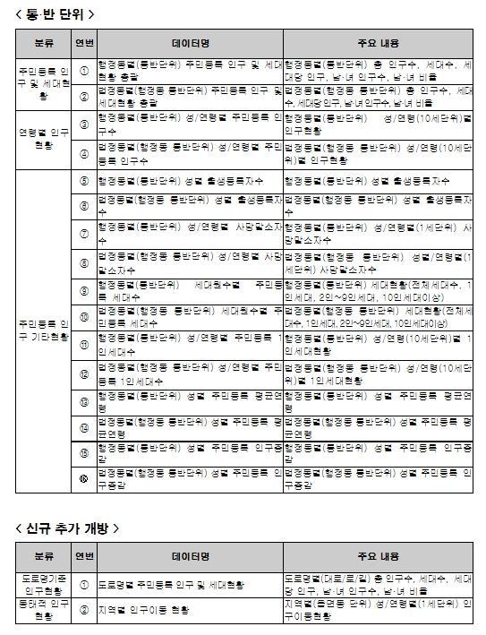 이번 사업을 통해 주민등록 인구 및 세대현황, 연령별 인구현황, 주민등록 인구 기타현황 등 16종 데이터가 기존의 읍?면?동 단위에서 행정구역상 최소단위인 통?반 단위로 촘촘하게 확대 개방된다.