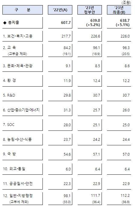 국회 심사 과정에서 △4.6조원이 감액되고, 3.9조원이 증액됨에 따라 ‘23년 총지출이 639.0→638.7조원(△0.3조원)으로 축소됐다.