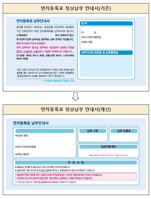 특허청은 국민편의 제고를 위해 2023년 2월부터 개선된 연차등록료 납부안내서를 발송할 계획이라고 밝혔다.