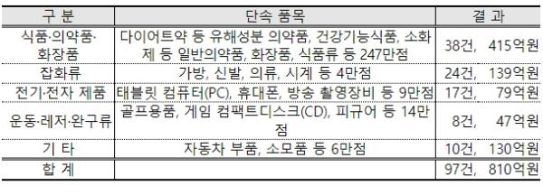 주요 품목으로는 식품·의약품·화장품(415억원), 가방·신발 등 잡화류(139억원), 전기·전자제품(79억원), 운동·레저용품·완구류(47억원) 등이 적발됐다.
