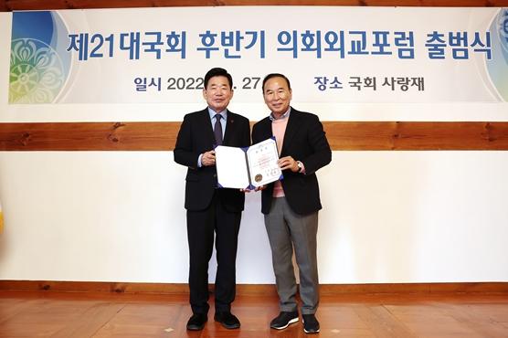 김진표 국회의장은 27일(화) 국회 사랑재에서 의회외교포럼 출범식을 열고, 정부가 미처 다루지 못한 부분에서 의회 차원의 외교 활동을 선도적으로 이끌 의회외교포럼에 박덕흠 의원(한-중앙아시아)을 비롯해 국민의힘 주호영(한-미), 조경태(한-일), 김영선(한-중), 더불어민주당에 변재일(한-미), 윤호중(한-일), 홍영표(한-중) 의원 등을 위촉했다.