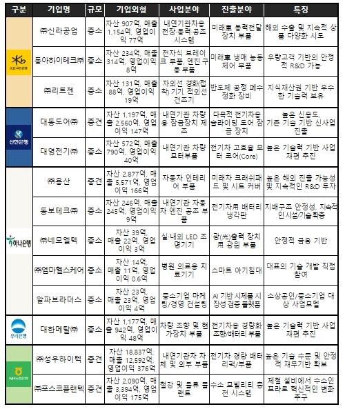 은행권에서는 주로 미래차 분야 기업을 추천했으며(추천 기업의 60%), 매출 평균 2,131억원으로 매출 및 재무안정성이 높다는 특징이 있다.
