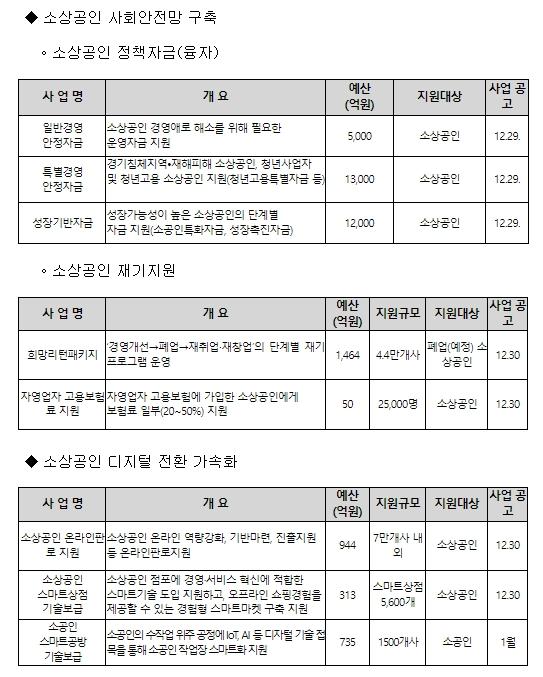 지원조건·내용 등 세부 사항이 담긴 사업별 공고는 29일부터 발표될 예정이며, 통합공고 및 세부사업 공고 등 내용은 중소벤처기업부 누리집, 소상공인시장진흥공단 누리집, 소상공인포털 등에서 확인할 수 있다.
