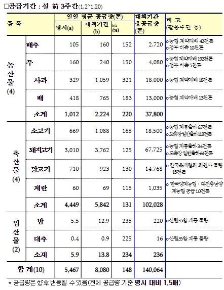 농식품부는 설 성수기 농축산물 수급 안정을 위해 설 3주 전인 1월 2일부터 정부 비축, 농협 계약재배 물량 등을 활용하여 10대 성수품의 공급을 평시 대비 1.5배 확대*할 계획이다. 특히 선물꾸러미 수요가 집중되는 설 전 2주 차에 전체 공급량의 40.6%(57천 톤)를 집중 공급하고, 설 전 3주 차에 31.5%(44천 톤), 설 전 1주 차에 27.9%(39천 톤) 순으로 공급량을 배분하여 수급 안정을 도모할 계획이다.