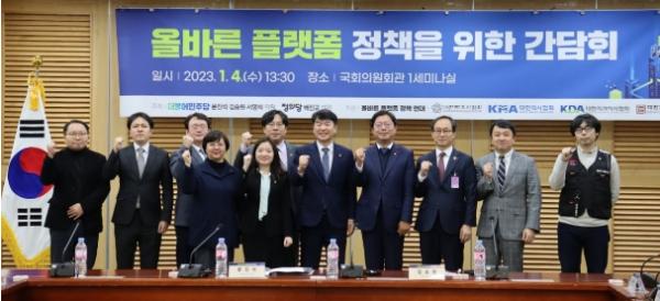 이날 간담회는 더불어민주당 문진석 의원, 김승원 의원, 서영석 의원, 정의당 배진교 원내대표가 공동주최 했으며, 올바른 플랫폼 정책연대(대한변호사협회, 대한의사협회, 대한치과의사협회, 대한건축사협회로 구성)가 주관했다.