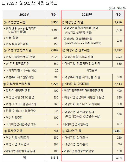 특히 올해에는 최근 경영환경 변화에 맞춰 온라인 교육 및 컨설팅 프로그램을 확대하고, 성공한 여성 CEO가 예비 여성 기업인에게 살아있는 현장 경험과 노하우를 전수하는 ‘미래여성경제인육성’ 사업을 신설하는 등 관련 예산이 최초로 100억원을 넘어섰다.