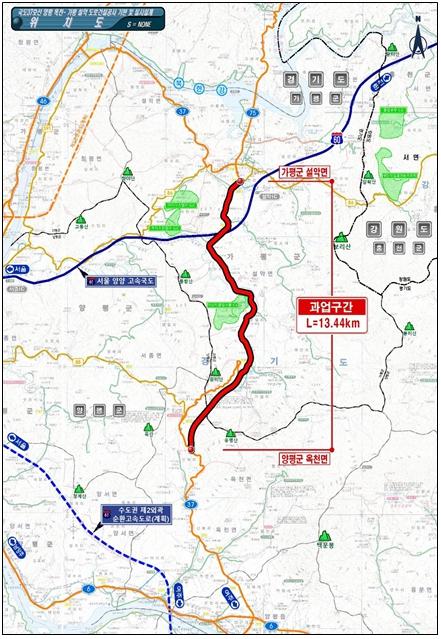‘양평 옥천-가평 설악 국도 개량 사업’은 양평군 옥천면 용천리에서 가평군 설악면 신천리까지 13.4km 2차로를 개량하는 사업으로, 총사업비 1,504억원이 투입된다.