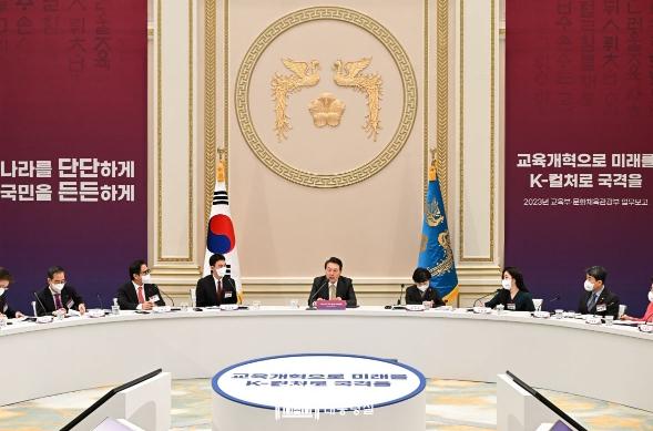윤석열 대통령은 1. 5일 청와대 영빈관에서 교육부와 문화체육관광부로부터 2023년 교육·문화 정책 방향 보고를 받았다.
