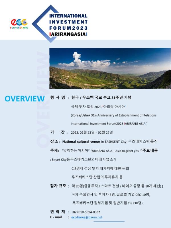 금번 참가 분야는 우즈베키스탄 건설분야, 우수한 상품, 문화 컨텐츠, 한국 중고자동차 수출, 요업기술분야, 등을 진출 시켜 다국가의 교류를 이어 나가는 것은 물론, 기업들의 발전을 도모하는 역할을 하는 한국의 경제, 문화 협력 교류 기관이다.