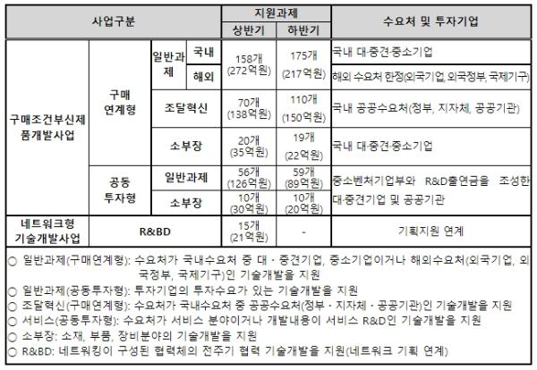 상용화기술개발 사업은 11일 구매조건부 상반기 공고를 통해 314개를 선정·지원하고, 4월에는 하반기 공고를 통해 구매조건부 373개, 연결형(네트워크형) 30개를 지원한다.