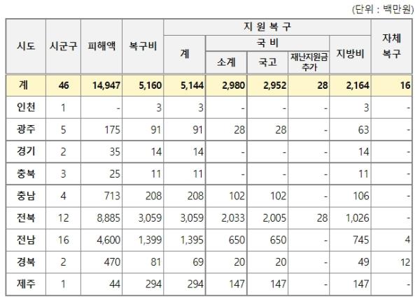 특히, 지난 11일 특별재난지역으로 선포된 순창 쌍치면의 경우 비닐하우스?축사 등 농업시설 피해가 집중되어 8.4억의 피해가 발생한 바 있다.