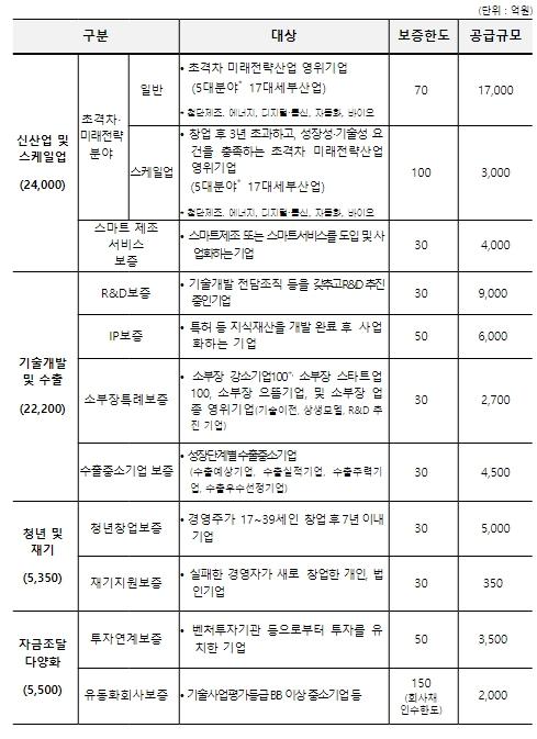 특히, 미래신산업 영위 기업 중 매출성장성이 높은 기업에 대해서는 성장단계별로 보증 한도를 최대 100억원까지 지원하는 확장(스케일업) 프로그램을 3,000억원 지원한다.