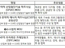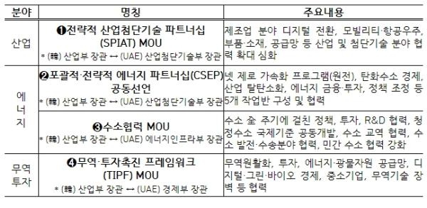 윤석열 대통령의 UAE 순방 계기, 2023년 1월 15일 산업통상자원부 및 에너지와 산업분야 유관기관?기업들은 UAE 측과 총 7건(산업 1건, 에너지 5건, 무역·투자 1건)의 공동성명, 양해각서 또는 계약을 체결했다.