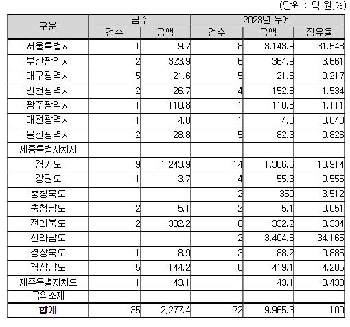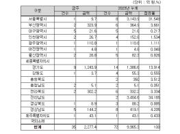 지역별로는 경기도 1,244억 원, 부산광역시 324억 원, 전라북도 302억 원, 그 밖의 지역이 407억 원이다.