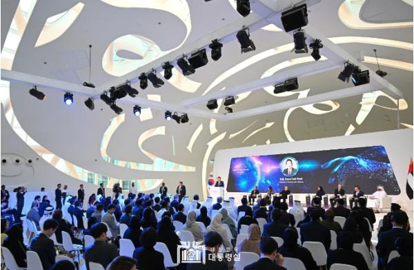 이날 행사는 윤 대통령과 함께 리처드 데이비드 헤임즈 아시아미래기획원 회장, 린다 밀스 뉴욕대 수석부총장, 레이 오 존슨 UAE 기술혁신연구소장 등 석학들과 사라 알 아미리 UAE 첨단기술 특임장관, 추경호 경제부총리, 이종호 과기정통부 장관 등 양국 정부 관계자가 패널로, 양국 각료, 기업인 등 150여 명이 청중으로 참석했다.