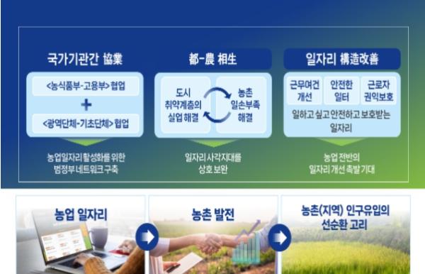 이에 농식품부와 고용부는 각 부처별로 시행되어 왔던 농업일자리 사업을 연계, ‘국가기관 간 협업(協業)’, ‘도농(都農) 상생’, ‘일자리 구조개선(構造改善)’을 기본체계로 하여 범정부 협업사업을 마련·시행하기로 했다.