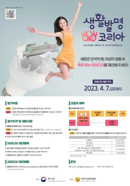 특허청이 주최하고 한국여성발명협회(회장 김순선)가 주관하는 ‘2023 생활발명코리아’ 아이디어 접수가 1월 25일부터 4월 7일까지 진행된다.