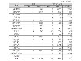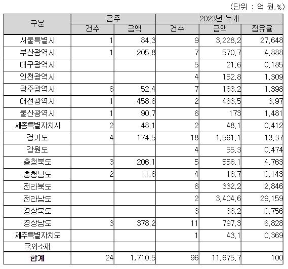 지역별로는 대전광역시 459억 원, 경상남도 378억 원, 충청북도 206억 원, 그 밖의 지역이 668억 원이다.