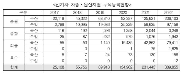 연료별로는 친환경차(전기ㆍ수소ㆍ하이브리드차)가 전년 대비 37.2%(431천대) 증가, 누적등록 대수는 전체자동차 중 6.2%(1,590천대) 비중을차지했다.