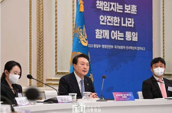 윤석열 대통령은 1. 27일 오전 청와대 영빈관에서 통일부, 행정안전부, 국가보훈처, 인사혁신처로부터 2023년 정책방향 보고를 보고 받았다. ‘책임지는 보훈, 안전한 나라, 함께 여는 통일’ 이라는 슬로건 아래 진행된 이 날 보고에는 권영세 통일부 장관, 이상민 행정안전부 장관, 박민식 국가보훈처장, 김승호 인사혁신처장을 비롯한 부처 실?국장, 민간 전문가, 정책수요자 등 160여 명이 참석했다.