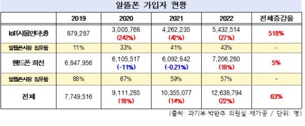 박완주 의원실이 과기부로부터 제출받은 자료에 따르면, 알뜰폰 가입자 수 폭증의 최대 요인은 사물인터넷(IoT) 회선 수가 518% 증가했기 때문이며 실 소비자인 핸드폰 회선의 가입자 수는 2020년부터 2021년까지 되레 감소했고 지난해 12월 기준 전체 증가율도 겨우 5%에 지나지 않은 것으로 확인됐다.