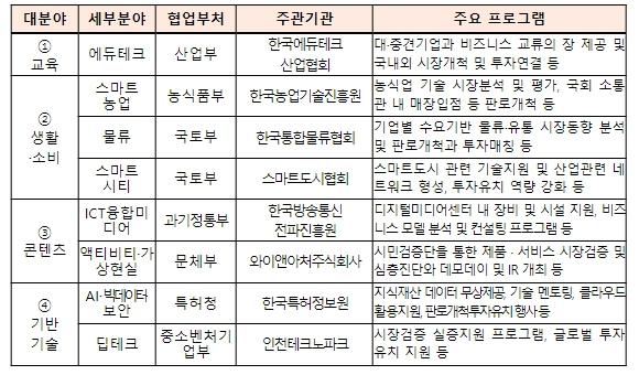 각 분야별 협업 부처가 창업기업을 선발하는 방향과 주요 지원 프로그램 내용은 다음과 같다.