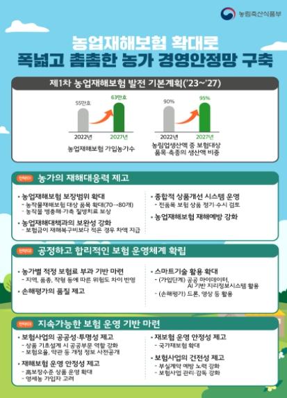 농림축산식품부는 핵심 국정과제인 ‘농가 경영안정 강화’ 추진의 일환으로 ?제1차(2023~2027) 농업재해보험 발전 기본계획?을 발표했다.