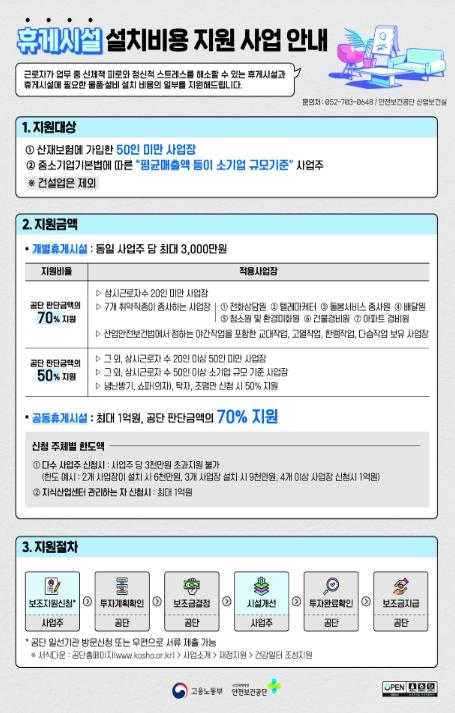 사업장 내에 휴게시설이 설치되어 있지 않거나 휴게시설 설치?관리 기준을 미준수하고 있는 상시근로자 50인 미만 사업장 또는 ?중소기업기본법?에 따라 주된 업종별 평균 매출액 등의 소기업 규모 기준에 해당하는 사업장에 대하여 사업주당 최대 3천만원을 지원한다.