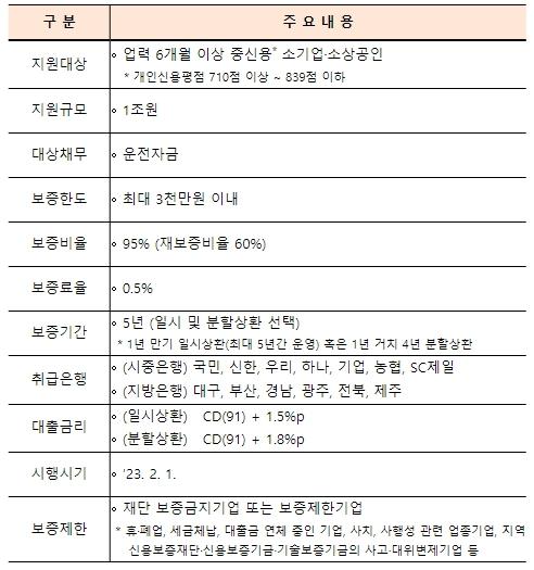 지원대상은 6개월 이상 영업중인 중신용(개인신용평점 710점 이상~839점 이하)인 소기업·소상공인이다. 다만, 세금체납, 사고·대위변제기업, 연체 중인 기업 등은 제외된다.