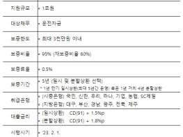 협약의 내용을 살펴보면, 중신용 소기업·소상공인의 금융비용 완화 및 원활한 자금 조달을 위해 1조원 규모의 특례보증을 시행하고, 사업자당 최대 3천만원 한도로 보증비율 상향(85%→95%), 보증료 우대(0.5%), 금리우대 혜택(일시상환 CD금리 + 1.5%p, 분할상환 CD금리 + 1.8%p 이내)을 제공한다.