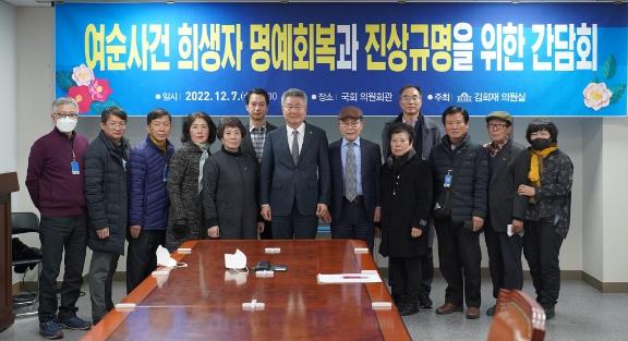 이에 김회재 의원은 지난해 12 월 7 일 여순사건 유족회 간담회를 통해 여순사건 희생자 및 유족들의 목소리를 청취하고 , 같은 달 8 일과 12 일 행안부 장관 , 행안부 여순사건 지원단장을 연이어 만나 여순사건의 완전한 해결을 위한 조사 전문인력 확충 , 여순사건 중앙위의 주기적 개최 , 신고기한 연장 등을 촉구한 바 있다.